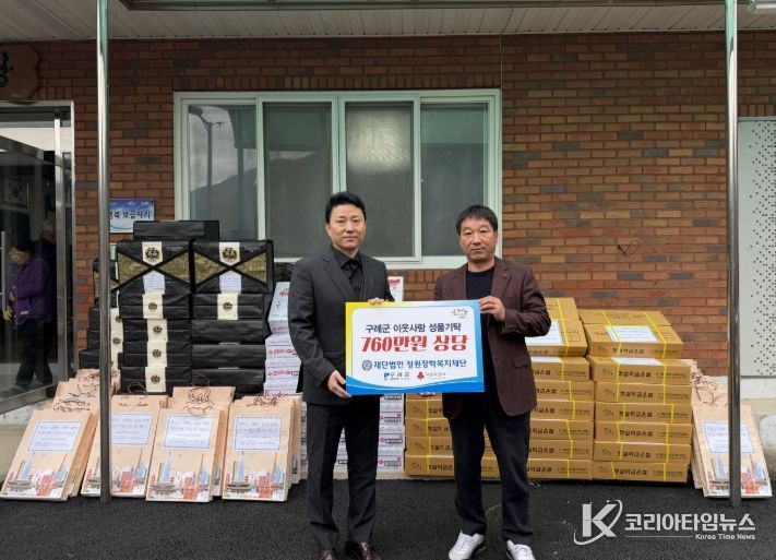 코리아타임뉴스 전남취재본부 | 전남 구례군은 12월 19일, (재)정원장학복지재단(이사장 김용만)에서 토지면 신촌마을 주민과 관내 가정위탁세대를 위해 쌀(20kg), 돼지고기 세트, 생필품 세트, 라면 등 총 760만 원 상당의 물품을 전달했다고 밝혔다.