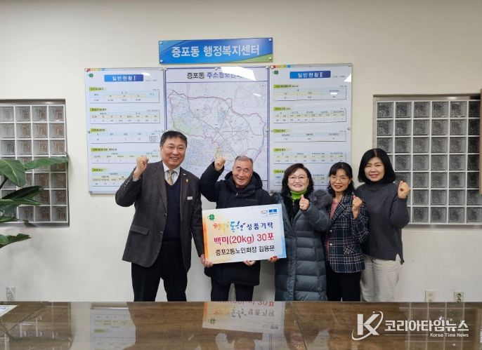 코리아타임뉴스 기동취재팀 | 이천시 증포동은 지난 12월 19일 증포동행정복지센터에서 증포2통 노인회 김용문 회장이 관내 취약계층을 위해 백미(20kg) 30포를 기탁했다고 밝혔다.