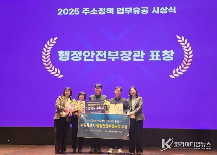 코리아타임뉴스 사회팀 | 수원특례시가 행정안전부 주관 ‘2025 주소정책 워크숍’에서 ‘2025 주소정책 업무 분야 우수기관’으로 선정돼 행정안전부 장관 표창을 받았다. 특별교부세 4000만 원도 확보했다.