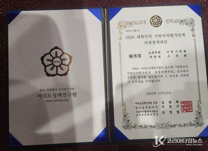 코리아타임뉴스 경남취재본부 | 사천시의회 구정화 의원이 12월 19일, 국회의사당에서 열린 여의도정책연구원 주최 ‘2025 지방자치평가 의정정책 우수상’을 수상했다.
