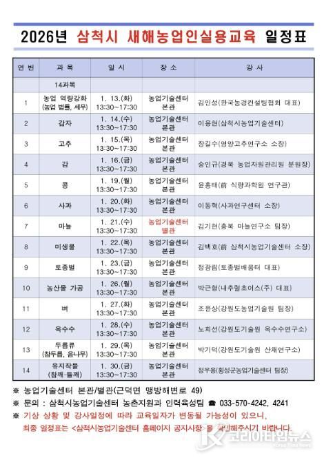코리아타임뉴스 이아름 기자 | 삼척시는 오는 1월 13일부터 1월 30일까지 지역 농업인 1,000여 명을 대상으로 ‘2026년 새해농업인실용교육’을 실시한다.
