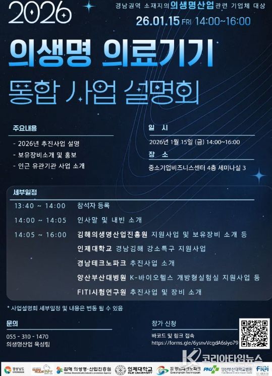 코리아타임뉴스 오영주 기자 | 김해의생명·산업진흥원은 오는 15일, 지역 내 의료기기 및 헬스케어 기업의 실질적인 경쟁력 확보를 돕기 위한 '2026년 의생명·의료기기 통합 사업설명회'를 개최한다.