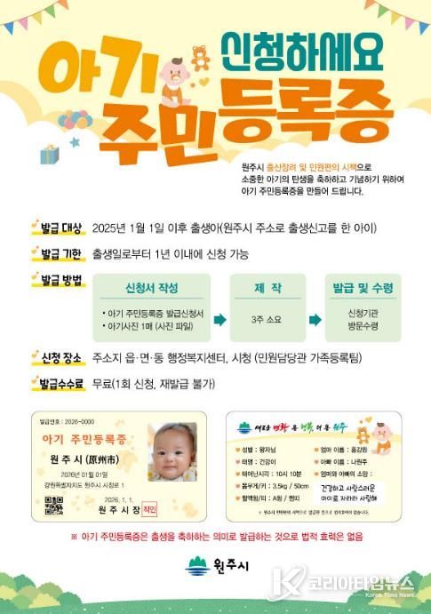 코리아타임뉴스 이아름 기자 | 원주시는 출산 장려 및 민원 편의를 위해 ‘아기주민등록증’ 무료 발급 사업을 올해도 지속해서 추진한다.