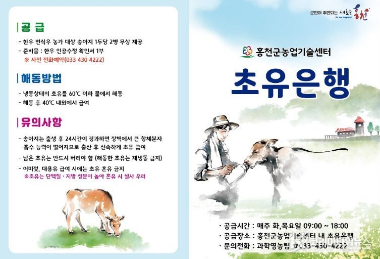 홍천군은 이러한 초유의 특성을 바탕으로 인공수정 확인서를 지참한 관내 농가에 1회 700mL 2병을 무상으로 지원해, 송아지 출생 직후 필요한 초유가 제때 급여되도록 적기 공급에 중점을 두고 있다.