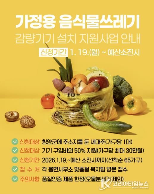 코리아타임뉴스 김택호 기자 | 청양군이 가정 내 음식물쓰레기 발생을 줄이고 쾌적한 주방 환경을 조성하기 위해 가정용 음식물쓰레기 감량기기 설치 지원사업 홍보에 나섰다.