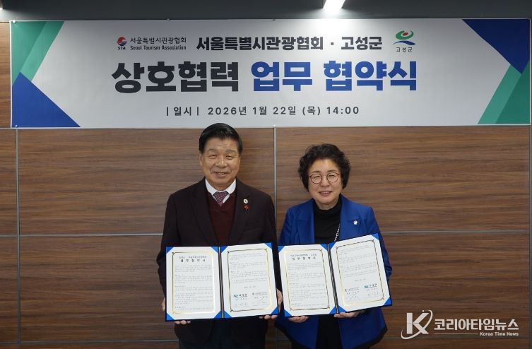 코리아타임뉴스 경남취재본부 | 경남 고성군은 1월 22일 서울특별시관광협회 회의실에서 서울특별시관광협회(회장 조태숙)와 지역 관광 활성화 및 관광산업 발전을 위한 업무협약(MOU)을 체결했다고 밝혔다.
