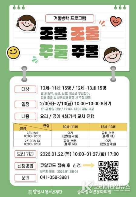 ![2026년 당진시 송악청소년문화의집 겨울방학 돌봄프로그램 [조물조물 주물주물] 프로그램 운영](/data/photos/portnews/202601/20260123055405-67012.jpg)