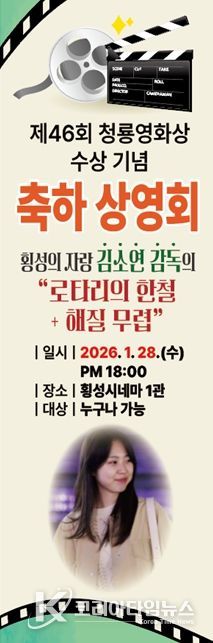 코리아타임뉴스 이아름 기자 | 횡성문화원은 제46회 청룡영화상 청정원 단편영화상 수상자인 김소연 감독을 초청해, 오는 1월 28일(수) 오후 6시부터 횡성시네마 1관에서 ‘청룡영화상 수상 기념 축하 상영회’를 개최한다.