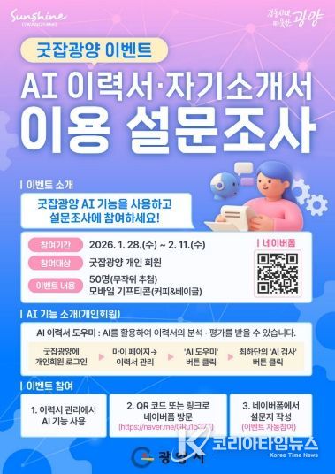 이번 이벤트는 1월 28일부터 2월 11일까지 진행되며, 굿잡광양 누리집에 이력서를 등록하고 AI 도우미 기능을 활용한 개인회원이라면 누구나 설문조사에 참여할 수 있다.