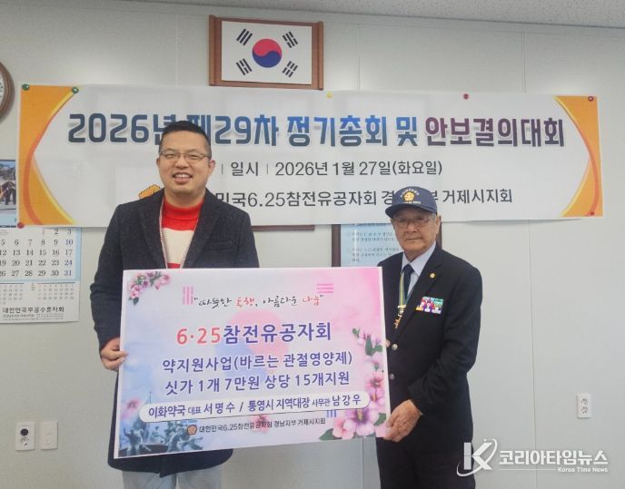 최병안 6·25참전유공자회 거제시지회장은 “올해도 잊지 않으시고 영양제를 기부해주시며 따뜻한 나눔을 실천해 주신 서명수 대표님과 남강우 사무관님께 진심으로 감사드리며 그 마음을 회원들에게 잘 전달하겠다”고 전했다.