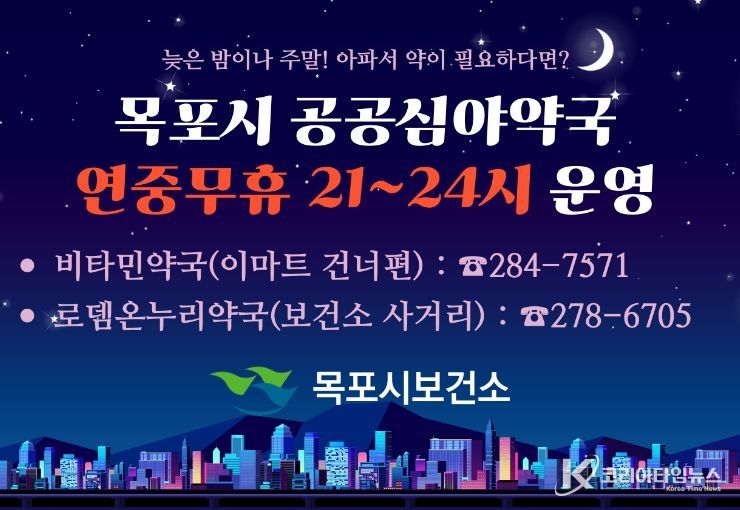 코리아타임뉴스 의료보건팀 | 목포시는 심야시간대(21:00~24:00)에 연중무휴로 운영되는 공공심야약국 사업을 2026년에도 지속 추진하며, 시민들로부터 높은 호응을 얻고 있다.