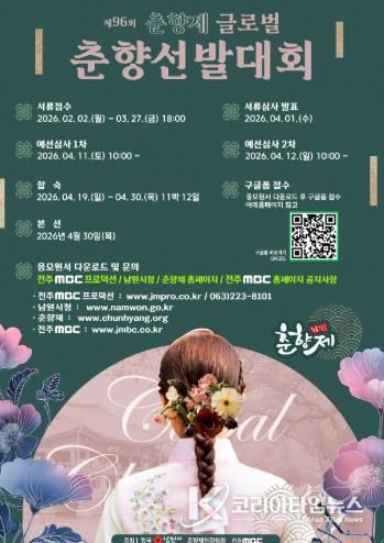 [20260202112252-88250]코리아타임뉴스 전북취재본부 | 남원시는 제96회 춘향제를 맞아 ‘글로벌 춘향선발대회’ 참가자를 2월 2일부터 3월 27일까지 모집한다.