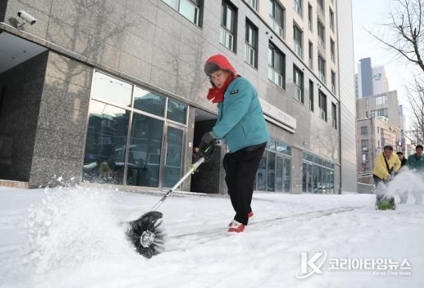 코리아타임뉴스 노승선 기자 | 2월 1일 밤 대설이 내린 가운데, 박강수 마포구청장은 2월 2일 오전 8시 공덕동 일대(만리재로 125)를 찾아 제설작업 현장을 살피고, 새롭게 도입한 전동식 제설장비를 활용해 직접 제설작업을 실시했다.