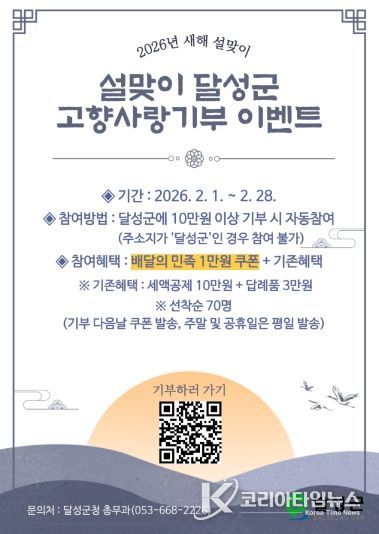코리아타임뉴스 노승선 기자 | 대구 달성군은 설 명절을 맞아 2월 한 달간 ‘설맞이 고향사랑기부제 특별 이벤트’를 진행한다.