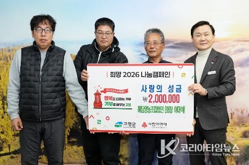 코리아타임뉴스 경북취재본부 | 고령군은 2월 3일 군수실에서 해담영농조합법인이 지역 내 저소득층을 위한 나눔 네트워크인 ‘함께모아 행복금고’에 성금 200만원을 기탁했다.
