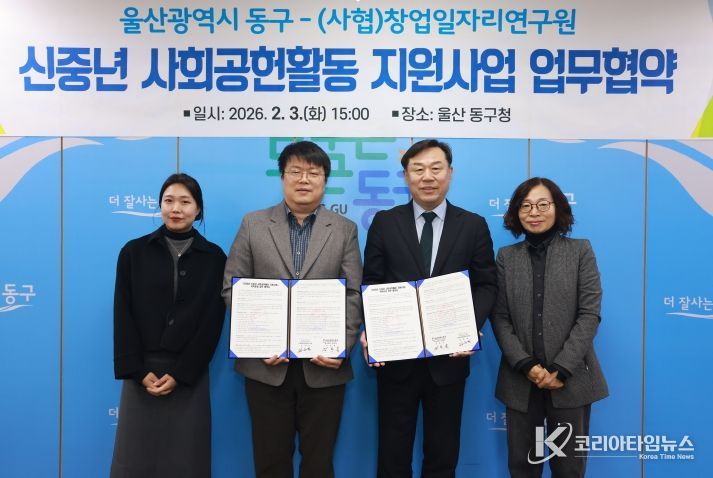 동구는 2월 3일 오후 3시 구청장실에서 (사협)창업일자리연구원(대표 김은석)과 ‘2026년 신중년 사회공헌활동 지원사업’ 추진을 위한 업무 협약을 체결했다.