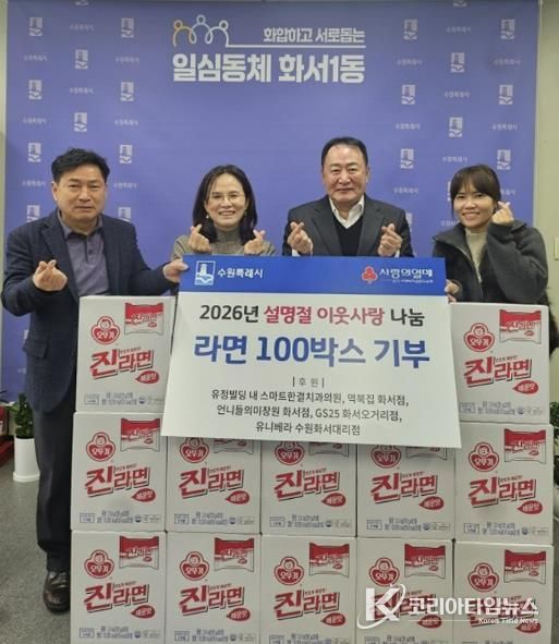 이번 기부는 유정빌딩 입주상가인 ▲스마트한결치과의원 ▲역북집 화서점 ▲언니들의 미장원 화서점 ▲GS25 화서오거리점 ▲유니베라 수원화서대리점이 지역 내 어려운 이웃을 돕기를 위해 뜻을 모아 마련했으며, 기부된 라면 100박스는 화서1동 행정복지센터를 통해 관내 저소득층 및 취약계층 가구에 전달될 예정으로, 설 명절을 앞두고 따뜻한 나눔의 의미를 더했다.