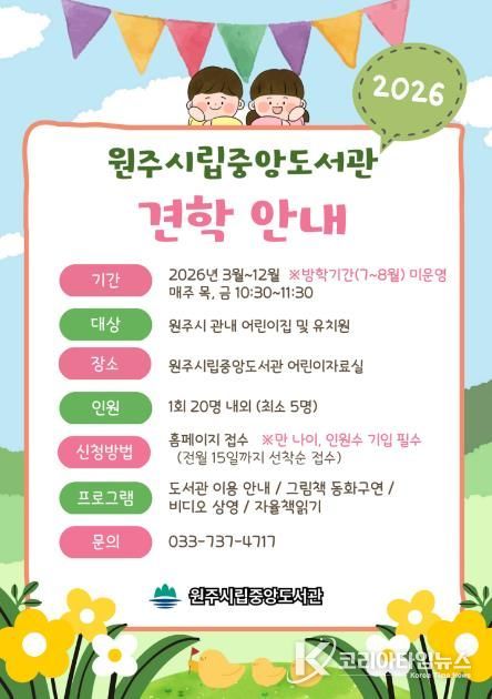 코리아타임뉴스 이아름 기자 | 원주시립중앙도서관은 오는 3월부터 12월까지 관내 유치원과 어린이집을 대상으로 도서관 견학 프로그램을 운영한다.