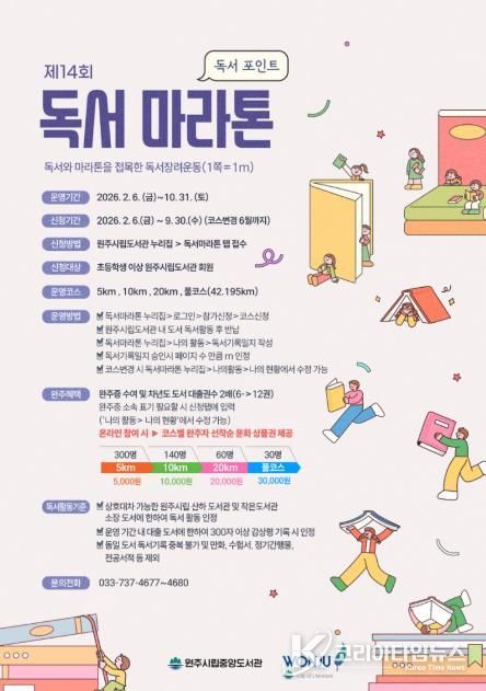코리아타임뉴스 이아름 기자 | 원주시립중앙도서관은 이달 6일부터 제14회 원주시 독서마라톤 참가자를 모집한다.