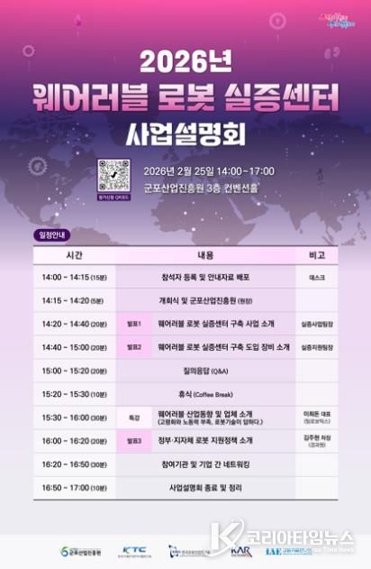 설명회 참석을 희망하는 기업 및 관계자는 행사 포스터 내 QR코드를 스캔하여 간편하게 사전 등록할 수 있으며 자세한 내용은 군포산업진흥원 홈페이지를 통해 확인할 수 있다.