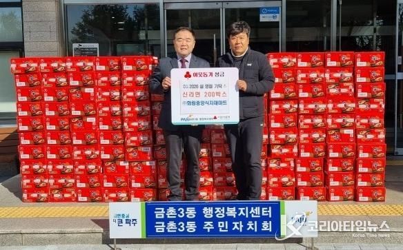 코리아타임뉴스 윤광희 기자 | 파주시 금촌3동은 ㈜화림중앙식자재마트 파주금촌역점으로부터 병오년 설 명절을 맞아 지난 3일, 라면(20개입) 200상자를 관내 취약계층과 노인 가구를 위해 기탁하며 따뜻한 나눔을 실천했다.