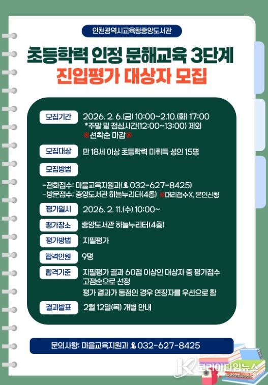 코리아타임뉴스 사회팀 | 인천광역시교육청중앙도서관은 초등 학력을 취득하지 못한 성인의 학력 취득 기회 제공을 위하여, ‘2026년 초등학력 인정 문해교육 3단계 진입평가’ 대상자를 모집한다.