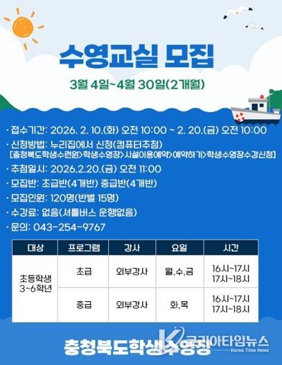 신청 기간은 이달 10일 오전 10시부터 2월 20일 오전 10시까지이며, 충북학생수영장 누리집을 통해 신청 가능하며. 2월 20일 오전 11시에 추첨을 통해 확정된다.