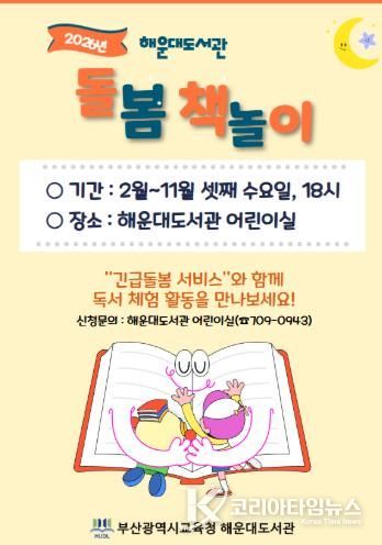 코리아타임뉴스 사회팀 | 부산광역시립해운대도서관은 2월부터 11월까지 매월 셋째 수요일 오후 6시 도서관 어린이실에서 긴급돌봄 서비스와 연계한 ‘돌봄 책놀이’ 프로그램을 운영한다고 밝혔다.