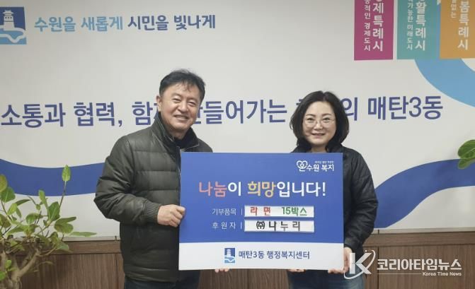 코리아타임뉴스 사회팀 | 수원시 영통구 매탄3동 행정복지센터는 지난 6일, 관내 폐기물 수거업체인 ㈜나누리로부터 설 명절을 맞아 어려운 이웃을 위한 라면 15박스를 기탁받았다고 밝혔다.