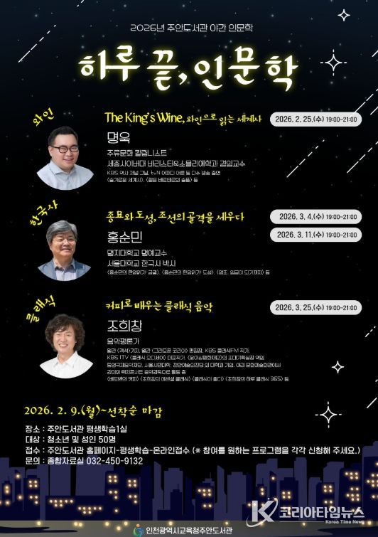 코리아타임뉴스 사회팀 | 인천광역시교육청주안도서관은 2월부터 3월까지 시민들이 다양한 인문학 주제를 접할 수 있는 야간 인문학 프로그램 ‘하루 끝, 인문학’을 운영한다.