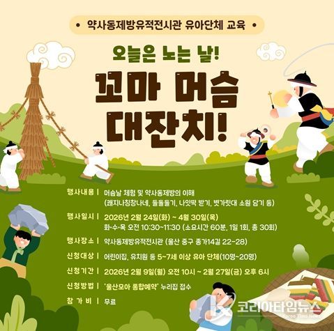코리아타임뉴스 사회팀 | 울산 약사동제방유적전시관이 관내 어린이집과 유치원 원아(5세~7세)를 대상으로 머슴날(음력 2월 1일)과 관련한 교육 프로그램 ‘오늘은 노는 날! 꼬마 머슴 대잔치!’를 운영한다.