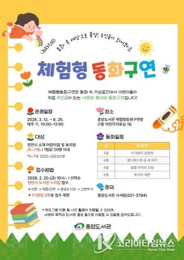 [ 천안시 중앙도서관은 오는 3~ 6월 ‘체험형 동화구연’ 프로그램을 운영한다고 19일 밝혔다.
