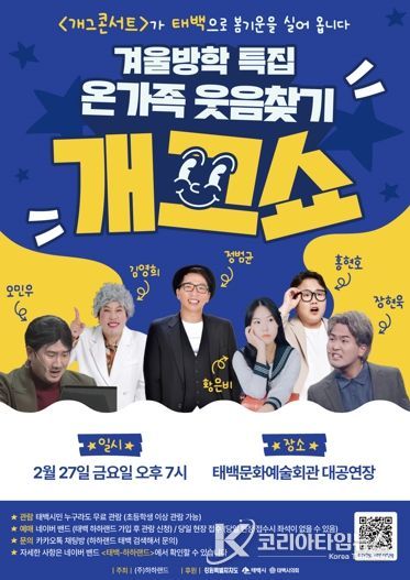 코리아타임뉴스 노승선 기자 | 태백시는 겨울방학을 맞아 오는 2월 27일 오후 7시 태백문화예술회관 대공연장에서 '온가족 웃음찾기 개그쇼'를 개최한다고 밝혔다.
