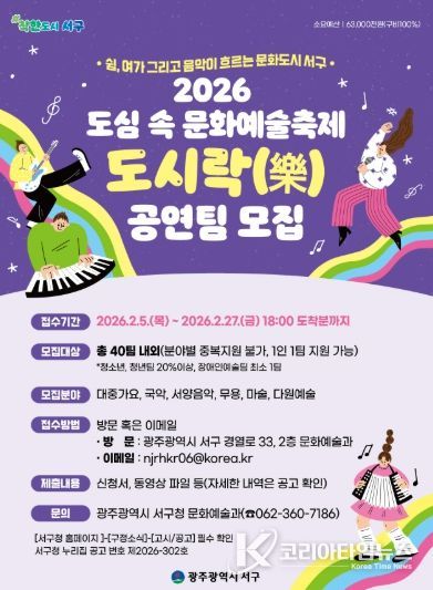 코리아타임뉴스 노승선 기자 | 광주광역시 서구는 지역 예술단체의 활동 기반을 넓히고 시민의 문화 향유 기회를 확대하기 위해 도심 속 문화예술축제 ‘도시 락(樂)’을 본격 추진한다.