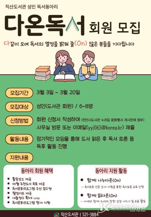 코리아타임뉴스 김택호 기자 | 천안시 직산도서관은 내달 3~ 20일 성인 독서동아리 ‘다온독서’ 참여자를 모집한다고 26일 밝혔다.