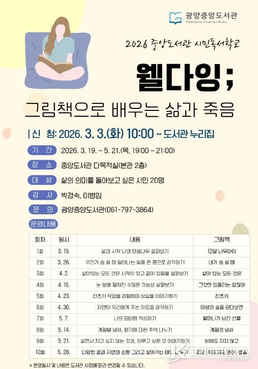 광양시 관계자는 “시민독서학교는 철학과 웰다잉 등 삶과 맞닿은 인문학 주제를 통해 시민들이 책을 깊이 있게 읽고 사유할 수 있도록 돕는 프로그램”이라며 “책을 사랑하는 시민들의 많은 관심과 참여를 바란다”고 전했다.