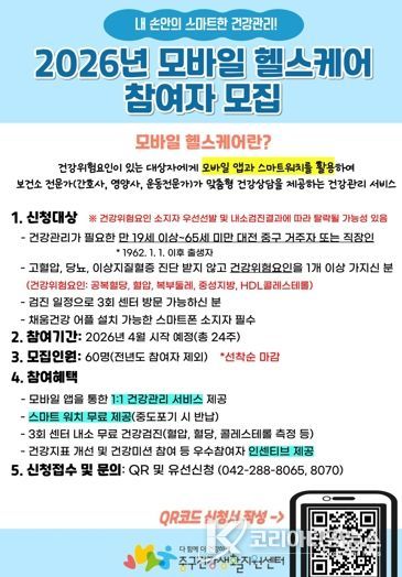 코리아타임뉴스 대전취재본부 | 대전 중구는 오는 3월 말까지 공공형 건강관리 서비스인 '모바일 헬스케어' 사업 참여자 60명을 선착순 모집한다고 밝혔다.