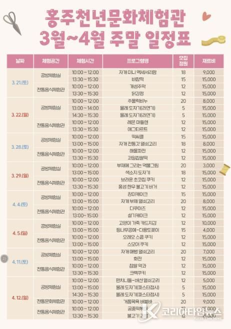 코리아타임뉴스 충남취재본부 | 홍성군 홍주천년문화체험관은 다가오는 봄을 맞아 오는 21일부터 4월 26일까지 매주 주말마다 다채로운 주말 체험 프로그램을 운영한다고 밝혔다.