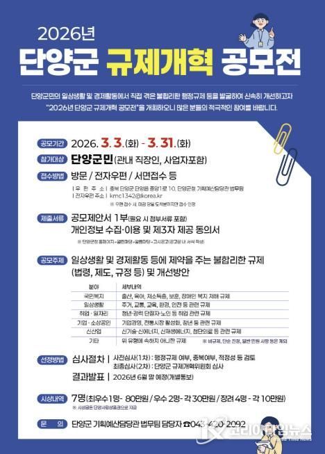 코리아타임뉴스 박찬식 기자 | 단양군이 군민의 일상생활과 경제활동에서 체감하는 불합리한 행정규제를 발굴하고 개선하기 위해 ‘2026년 단양군 규제개혁 공모전’을 개최한다.