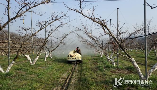 코리아타임뉴스 충북취재본부 | 옥천군농업기술센터는 복숭아 개화기를 앞두고 월동 병해충 적기 방제를 위한 현장 기술지도를 강화하고 있다.