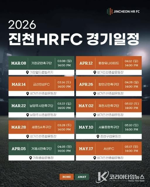 코리아타임뉴스 충북취재본부 | 충북 진천군을 연고로 한 신생 기업축구단 ‘진천HR FC’가 오는 14일 생거진천 종합운동장에서 역사적인 K4리그 홈 개막전을 치른다.
