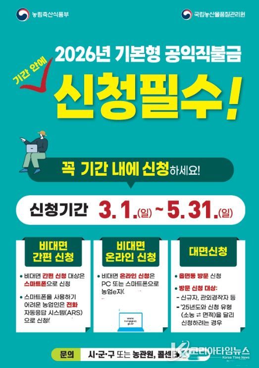 코리아타임뉴스 충남취재본부 | 충남 계룡시는 3월부터 오는 5월 31일까지 2026년 기본형 공익직불제(이하 공익직불제) 신청을 접수한다고 밝혔다.