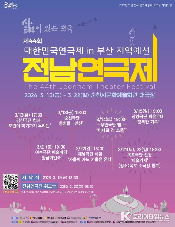 코리아타임뉴스 전남취재본부 | (사)한국연극협회 순천시지부는 ‘삶이 있는 연극’이라는 주제로 제44회 전남연극제를 오는 13일부터 22일까지 순천문화예술회관 대극장에서 개최한다고 밝혔다.