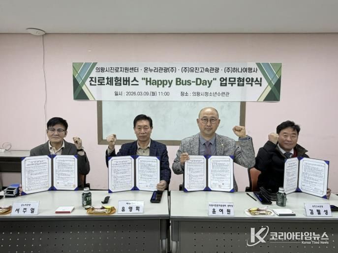 코리아타임뉴스 윤광희 기자 | 의왕시청소년재단 산하 의왕시진로지원센터 ‘꿈터’가 청소년들의 진로 탐색을 지원하기 위해 3월 9일 관내 운수업체와 ‘진로체험버스’ 운영을 위한 업무협약(MOU)을 체결했다.