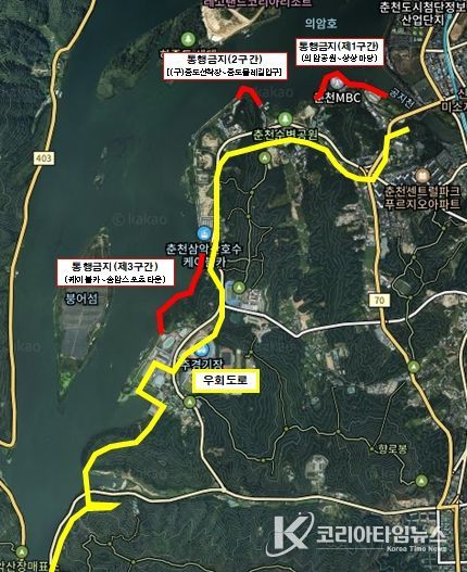 통행 제한 구간은 △의암공원~KT&G 상상마당(0.45㎞) △삼천동 구 중도선착장~중도물레길 입구(0.37㎞) △삼악산호수케이블카~송암스포츠타운(0.8㎞) 등 3곳이다. 통행 제한 기간은 구간별로 다르다. 의암공원~KT&G 상상마당 구간은 11일부터 20일까지, 삼천동 구 중도선착장~중도물레길 입구 구간은 13일부터 20일까지, 삼악산호수케이블카~송암스포츠타운 구간은 11일부터 31일까지 통행이 제한된다. 공사 여건에 따라 통행 제한 기간은 일부 조정될 수 있다.