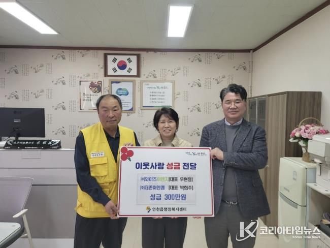 코리아타임뉴스 윤광희 기자 | 연천군 소재 ㈜와이즈이앤지와 ㈜더존이엔엠은 지난 9일 연천읍 행정복지센터를 방문해 관내 어르신들을 위한 경로잔치 준비에 써달라며 성금 300만원을 기탁했다.
