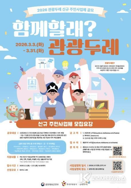 코리아타임뉴스 경기취재본부 | 광명시가 지역 자원을 활용해 관광사업을 이끌어갈 ‘2026년 관광두레’ 신규 주민사업체를 모집한다고 11일 밝혔다.