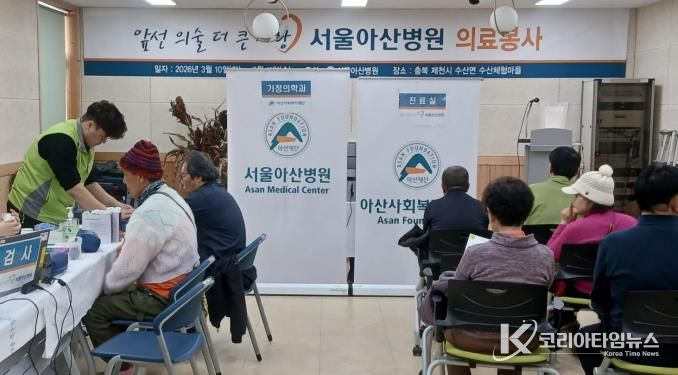 코리아타임뉴스 충북취재본부 | 제천시 수산면 ‘수산체험마을’ 1층에서는 수산면 주민자치위원회 주관으로 서울아산병원 의료봉사팀의 이동병원 진료가 진행돼 지역 주민들에게 따뜻한 온기를 전했다.
