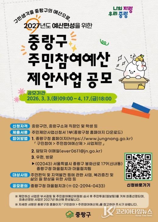 코리아타임뉴스 오영주 기자 | 중랑구가 2027년도 예산에 반영할 주민참여예산 사업을 발굴하기 위해 오는 3월 3일부터 4월 17일까지 총 11억 원 규모의 주민참여예산 제안사업 공모를 실시한다.