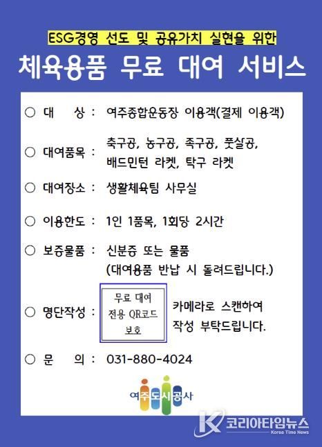 코리아타임뉴스 기동취재팀 | 여주도시공사는 여주종합운동장 이용 시민들의 편의를 높이기 위해, 2023년부터 시행해 온 ‘체육용품 무료대여 서비스’를 오는 2026년 4월 1일부터 대폭 확대 운영한다.